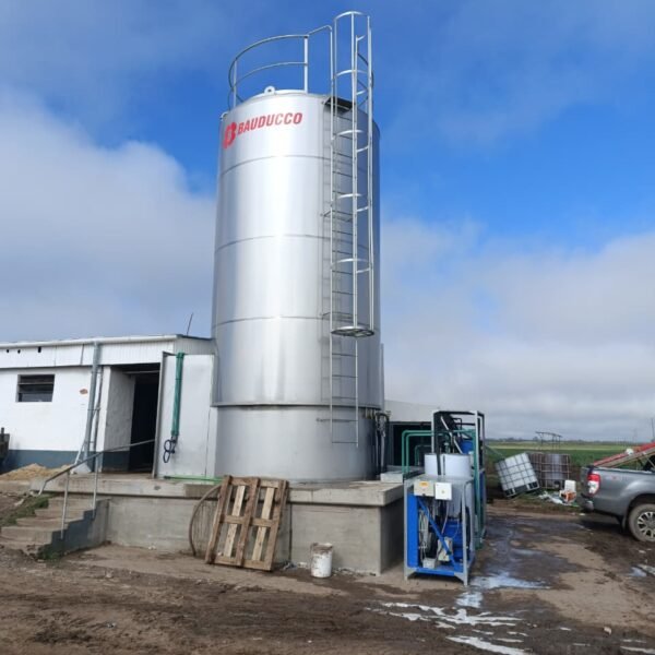 Instalación de silo enfriador de leche marca Bauducco modelo “SED4000” de 40.000 lts de capacidad. el mismo cuenta con 5 módulos intercambiadores en el mismo silo + 3 unidades de 15 hp + 2 recuperadores de calor.